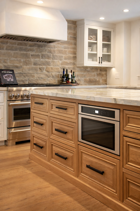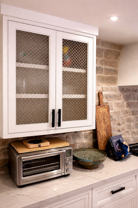 This Carlsbad villa kitchen draws on Tudor Revival character with a fresh California sensibility. Inset cabinetry highlights tight reveals, stepped profiles, and furniture style toe details that feel rooted and architectural. Wire mesh cabinet inserts, framed panels, and tailored moldings add period texture, while natural stone and warm wood tones soften the palette. Every cabinet was built for proportion and function, from the paneled island to the glass front uppers. The result is a kitchen that feels storied yet refined, designed to age beautifully and support daily living.