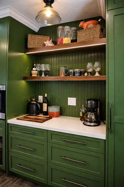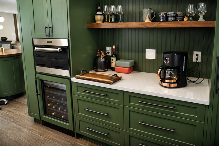 This kitchen pairs tailored cabinetry with a warm, grounded palette, balancing classic proportion with a fresh, design-forward sensibility. Rich green millwork anchors the space, complemented by crisp painted cabinetry and natural wood accents that introduce depth and texture. Tight reveals, integrated panels, and thoughtfully composed storage create a seamless visual flow, while open shelving and furniture-style elements soften the architecture. Every cabinet was designed with both utility and longevity in mind, resulting in millwork that feels considered, functional, and quietly refined — built to support daily life while aging with character.